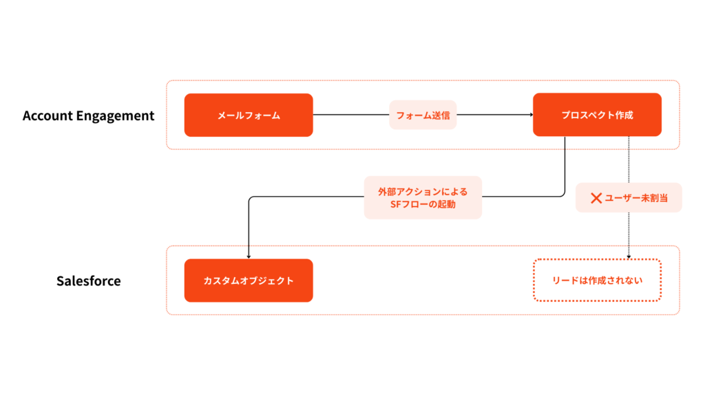 Account Engagementのフォーム送信をトリガーに、Salesforceで指定したフローが実行され、カスタムオブジェクトの新規レコードが作成される、というのが全体の流れです。