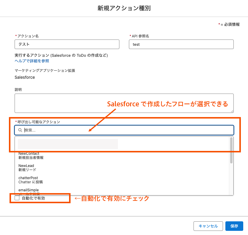 - マーケティングアプリケーション拡張の作成とアクションとしてSFで作成したフローを設定