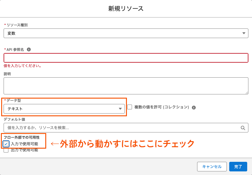 ポイントはフロー種別として「自動起動フロー(トリガーなし)」を選択することと、レコードの各種項目にフォームの値を入力するために[入力で使用可能]にチェックを入れた変数を作成することです。