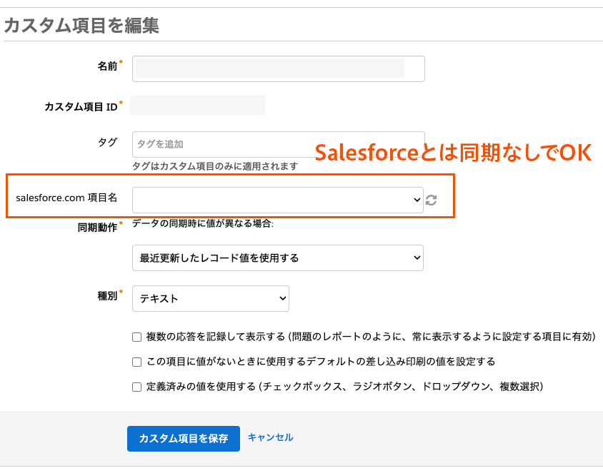 フォームで送信される内容を受け取るために、Account Engagement上にカスタム項目を作成しておきます。Salesforce側と同期する必要はありません。