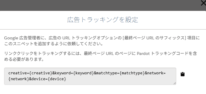 接続したGoogle広告アカウントの管理画面から、広告のURLトラッキングオプションの[最終ページ URL のサフィックス]項目に取得したスニペットを追加します。