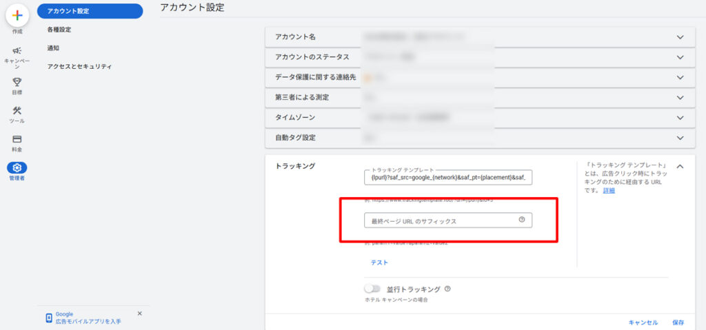 - Google広告アカウント設定の広告のURLトラッキングオプションの[最終ページ URL のサフィックス]項目