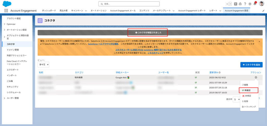 - Account Engagementの広告コネクタ右列の[歯車]から[再確認]