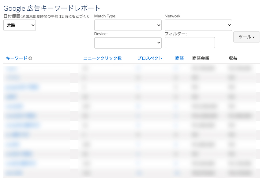 このレポートでは、Google広告で設定した検索広告のキーワード別にクリック数や獲得に繋がったプロスペクト・商談・商談金額・収益が確認できます。