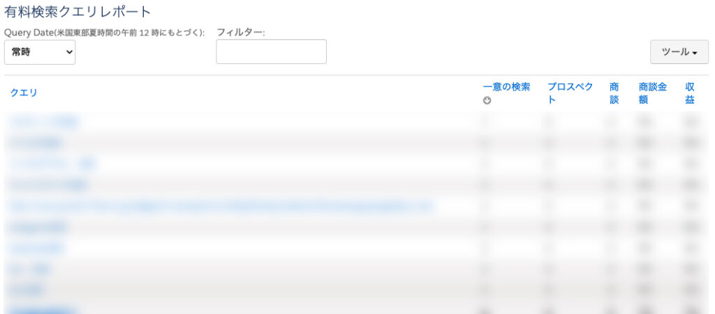 このレポートでは、Google広告で計測した実際のユーザーの検索クエリ別にクリック数や獲得に繋がったプロスペクト・商談・商談金額・収益が確認できます。