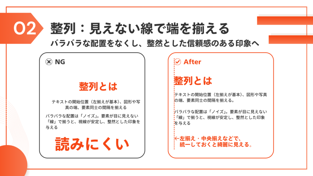これらを徹底的に揃えます。スライド上に「見えない線」があることを意識し、そこにピッタリと沿わせるイメージです。 要素がバラバラに配置されているとノイズになりますが、揃っているだけで整然とした印象を与え、信頼感が増します。