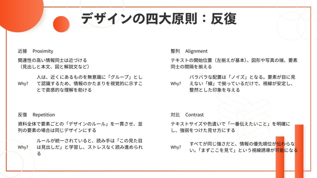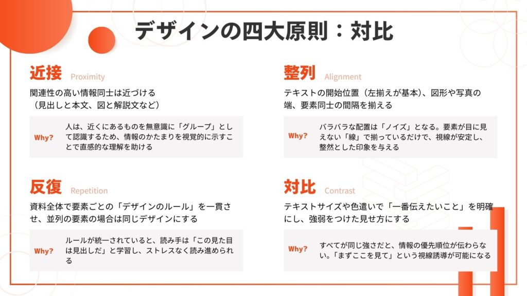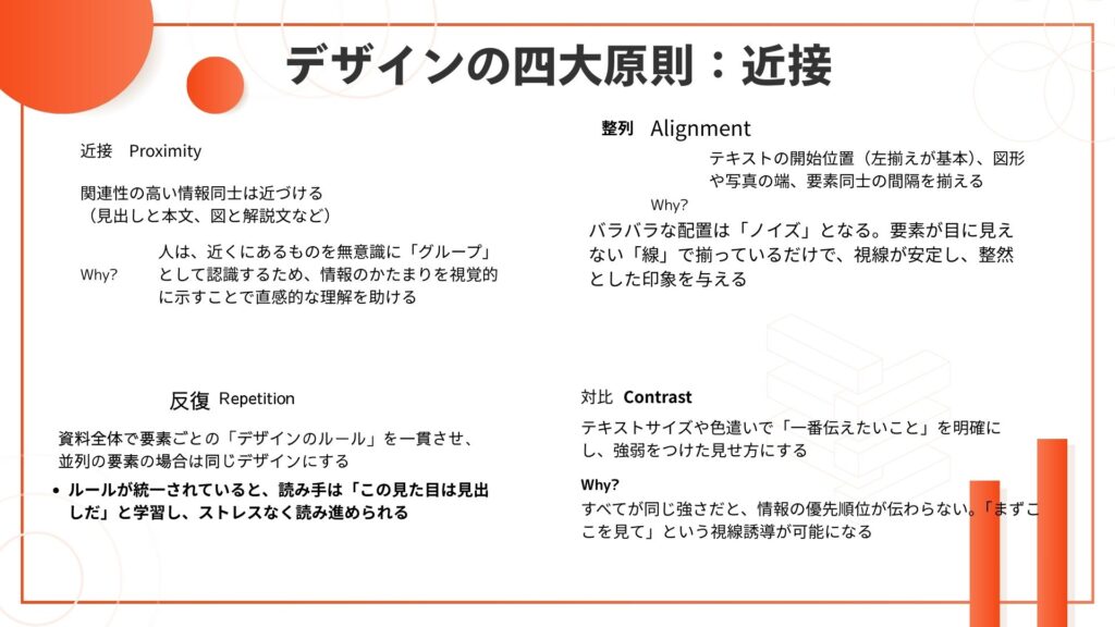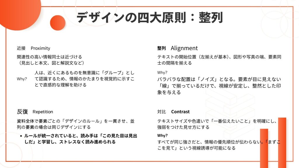 先ほども少し触れたように、デザインには、基本となる「4大原則」があります。これらを守るだけで、資料の見た目は大きく整います。まずはこの4つを意識することから始めましょう。