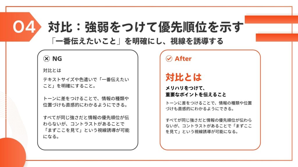 強弱をつけることで、「まずここを見てほしい」という視線誘導が可能になります。