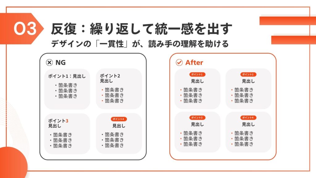 「反復」とは、資料全体を通してデザインのルールを統一することです。