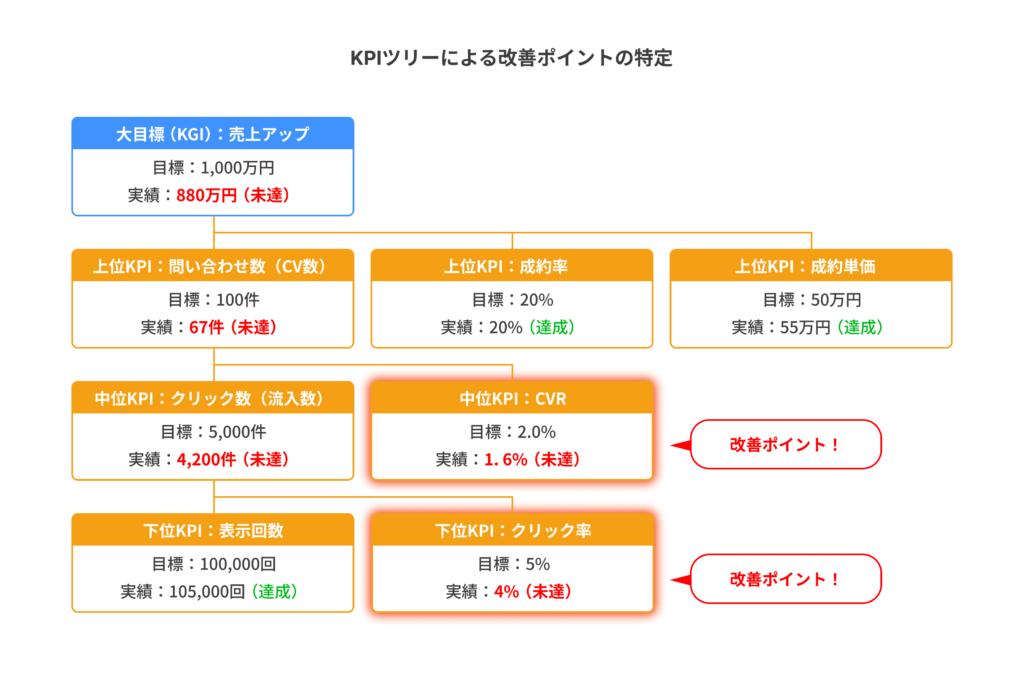 成果が出ていないときには、どこに課題があるかを深掘りし、仮説立てをして改善につなげていく必要があります。