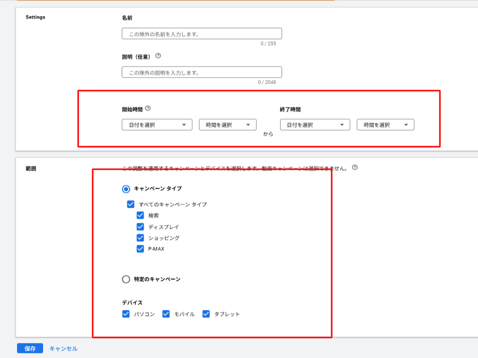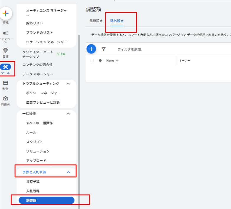 - 設定箇所: [ツール] > [予算と入札単価] > [調整額] > [除外設定]