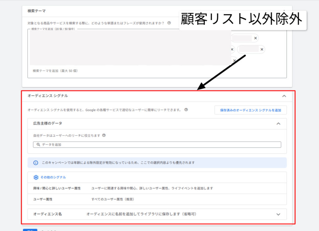 これを逆手にとり、あえてオーディエンスシグナルを削除することで、参照先をなくし、検索面など他の配信面へ戻るよう仕向けることができます。