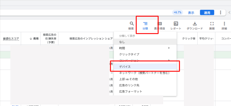管理画面の [分類] > [デバイス] から、PCとスマートフォンの配信割合を確認してください。 「本来PCでのコンバージョンが多い商材なのに、スマホへの配信が9割を超えている」といった極端な偏りがある場合、機会損失が発生している可能性があります。