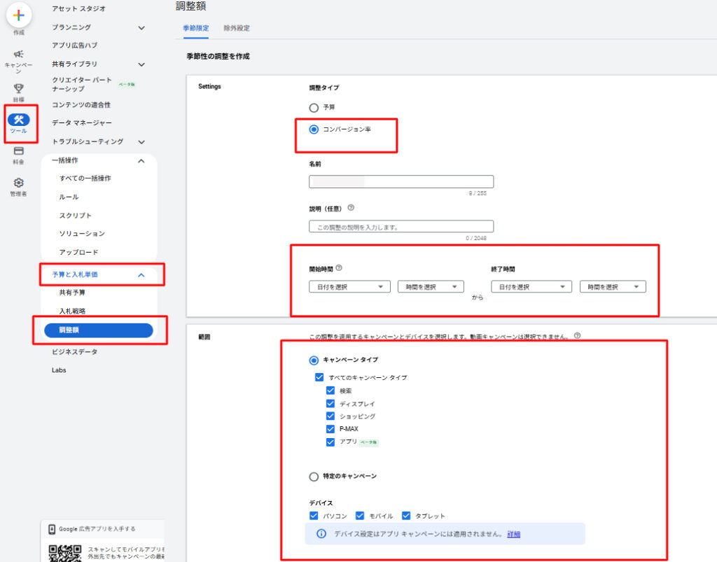 - 設定箇所: [ツール] > [予算と入札単価] > [調整額] > [コンバージョン率]