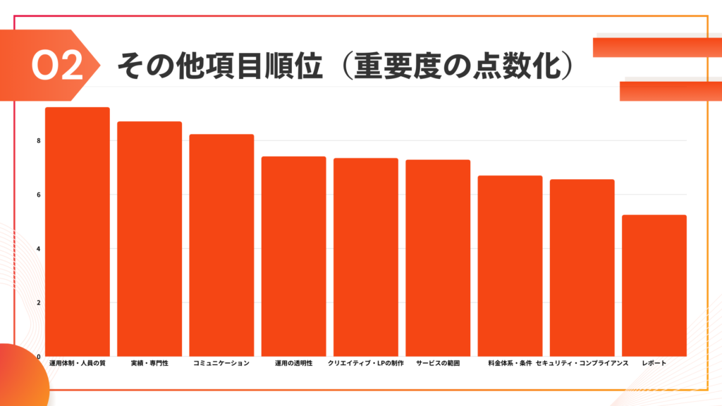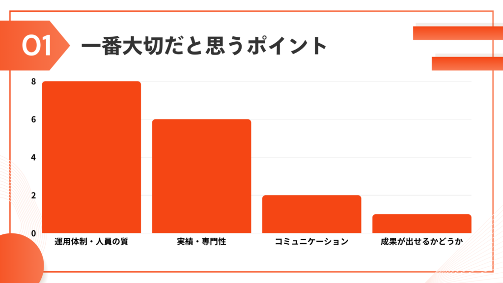 N村: やっぱり! 1位はダントツで「運用体制・人員の質」。次いで「実績・専門性」、「コミュニケーション」という結果でした。「成果が出せるか」という意見もありましたけど、それも含めて結局は「誰がやるか」次第。みんな「人」を重視してるってことですね。